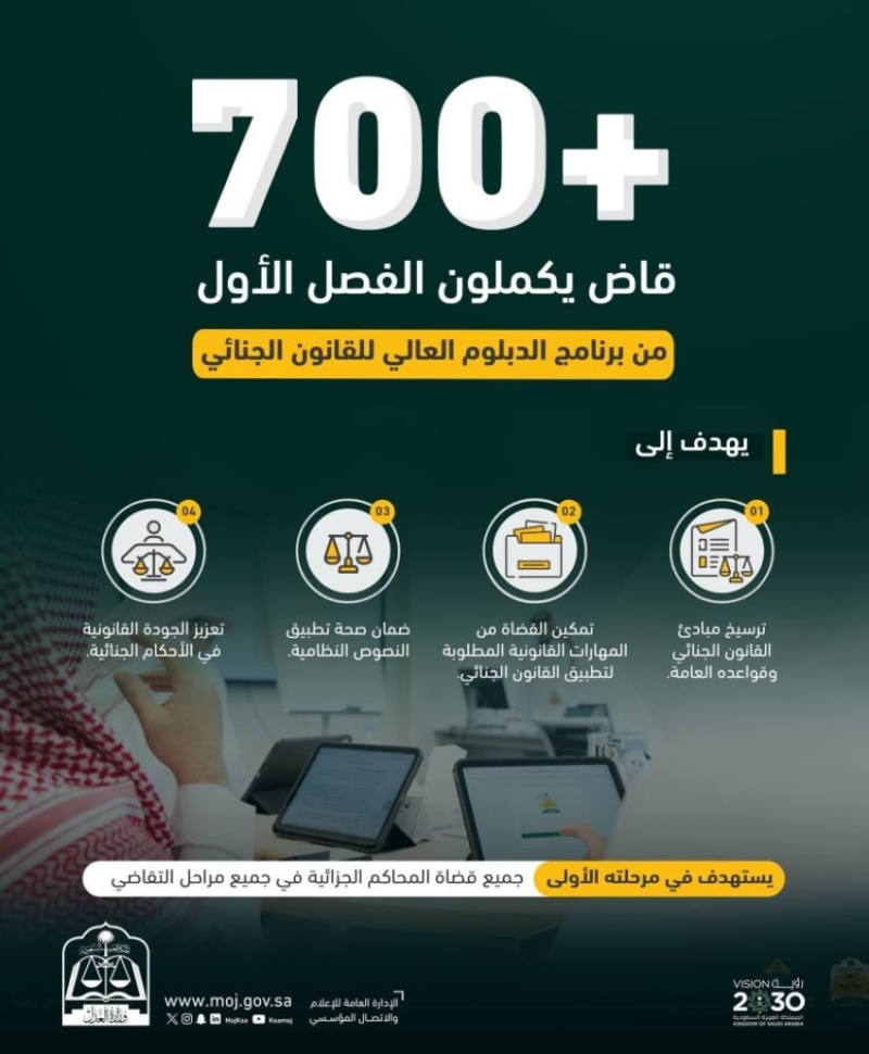 أعلنت وزارة العدل، اكتمال الفصل الأول من برنامج الدبلوم العالي للقانون الجنائي، بمشاركة أكثر من 700 متدرب من قضاة المحاكم والدوائر الجزائية في محاكم الدرجة الأولى والاستئناف والمحكمة العليا، بمجموع 165 ساعة تدريبية لكل متدرب.ويستهدف البرنامج الذي أطلقه معالي وزير العدل الدكتور وليد بن محمد الصمعاني، جميع قضاة المحاكم الجزائية في المملكة في جميع مراحل التقاضي، ويأتي امتداداً لما تشهده المملكة من تطور تشريعي.